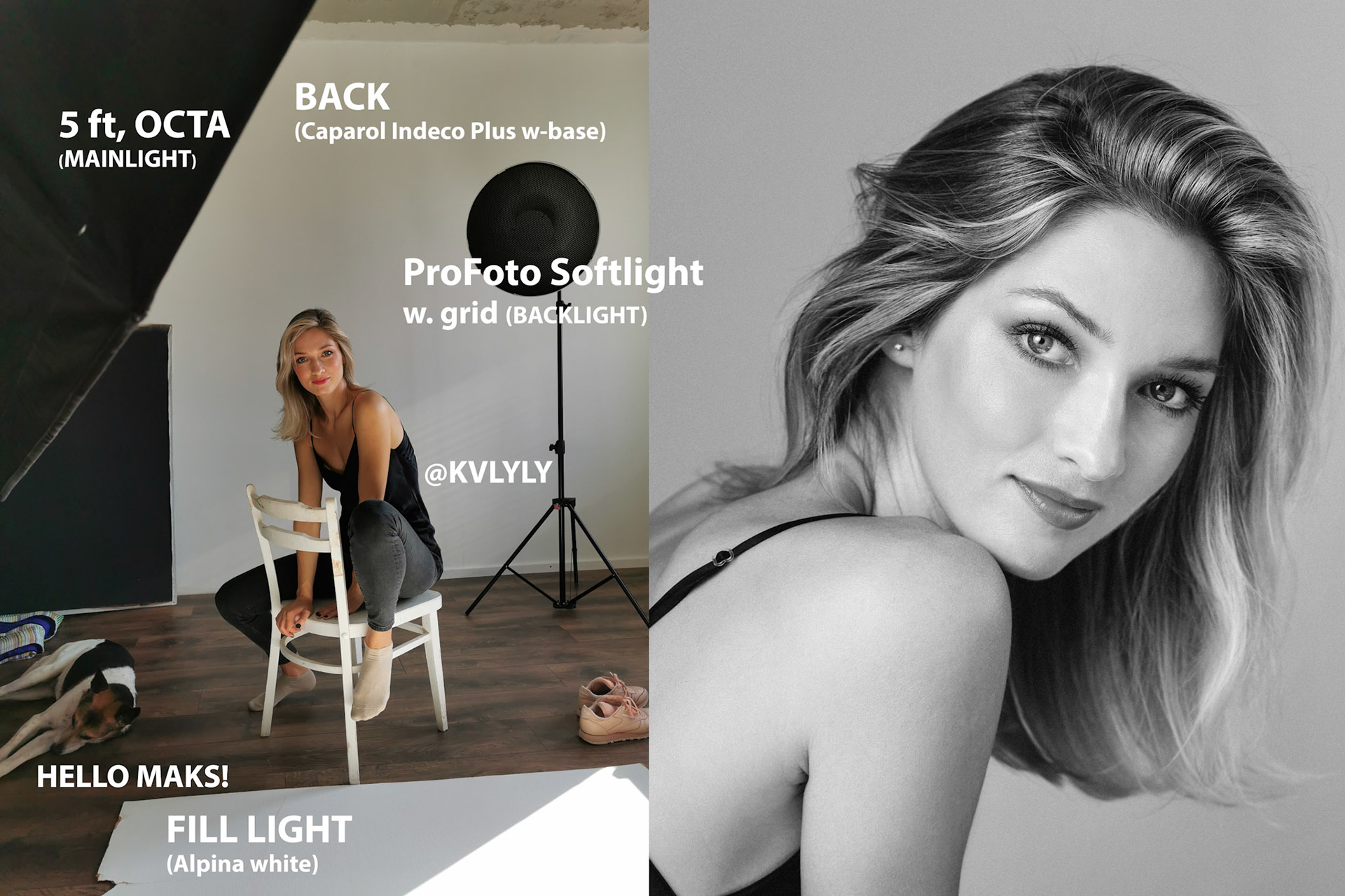 A sample of a lightning setup in a home studio for shooting beauty portraits using a beauty dish and a Profoto octabox. Yongnuo YN560III speedlights were used instead of studio monoblocks.